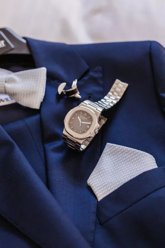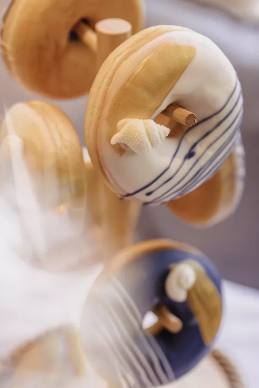 Unter Deck ist alles liebevoll vorbereitet. Umrahmt von floralen Highlights in sanftem Rosé und Apricot entsteht ein harmonisches Ensemble aus frischen Sommerfarben. Lisianthus, Rittersporn, Clematis und zarte Ranunkeln bringen Leichtigkeit und Eleganz ins Hochzeitskonzept. Auch die Tischdekoration greift das maritime Thema detailreich auf: Treibholz, kleine Segelboote, Muscheln und Taue schaffen eine liebevolle Atmosphäre. Gedeckte Farben, goldene Akzente, Glas- und Keramikelemente bringen feinen Glamour an den Tisch. Die Hochzeitspapeterie – in Seestern- und Muscheloptik mit Aquarellakzenten und Blattgold – wird zum gestalterischen Highlight. Neben Beigetönen ziehen sich bei dieser Hochzeit am Wasser sanfte Blaunuancen durch – ob in der Patisserie oder im Outfit des Bräutigams.