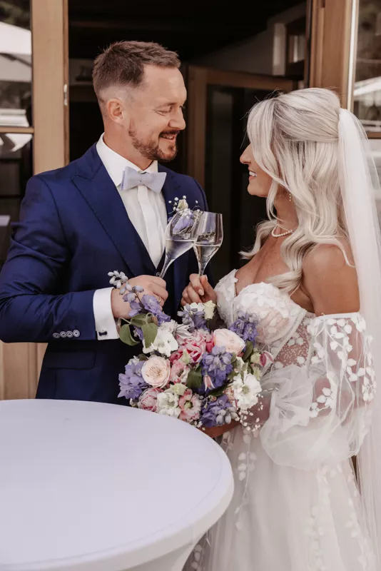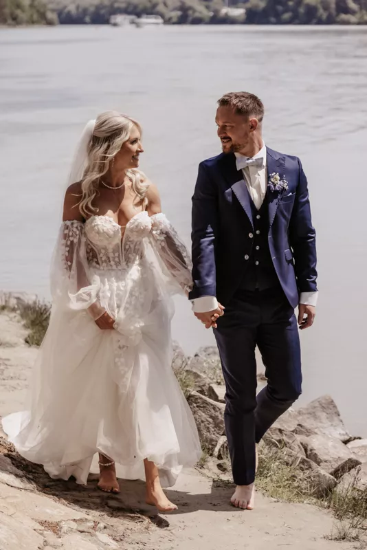 Dort, wo Ill, Ilz und die imposante Donau aufeinandertreffen, wird die Liebe zweier Menschen für immer festgehalten. Barfuß schlendert das Brautpaar über das sandige Ufer. Das Wasser trifft sanft auf die steinernen Mauern der Promenade und gibt dabei einen eigenen Rhythmus vor – so beginnt der Hochzeitstag auf ganz natürliche Weise. Noch bevor sich alle für die Zeremonie bereitmachen, genießen die beiden – ganz für sich – den Ausblick auf die Stadt, die sich hinter dem leicht wellenden Wasser abzeichnet.