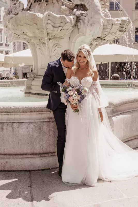 An Land und beim romantischen Couple Shooting vor historischem Brunnenflair präsentiert sich die Braut in einem zweiten Hochzeitskleid: Dieses Brautkleid besticht durch ein Off-Shoulder-Design mit voluminösen Tüllärmeln und floralem 3D-Applikationen. Während die Braut mit offenen Haaren und ihrem fließenden Brautkleid fast schwerelos wirkt, strahlt ihr Bräutigam im dunkelblauen Hochzeitsanzug Ruhe und Stilbewusstsein aus – die beiden wirken wie Fels und Brandung.